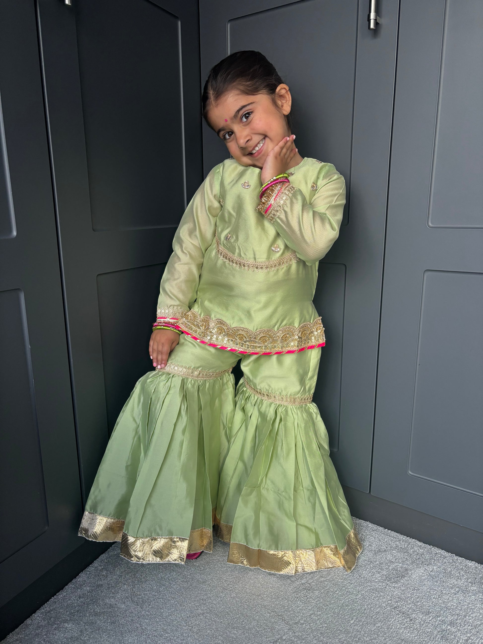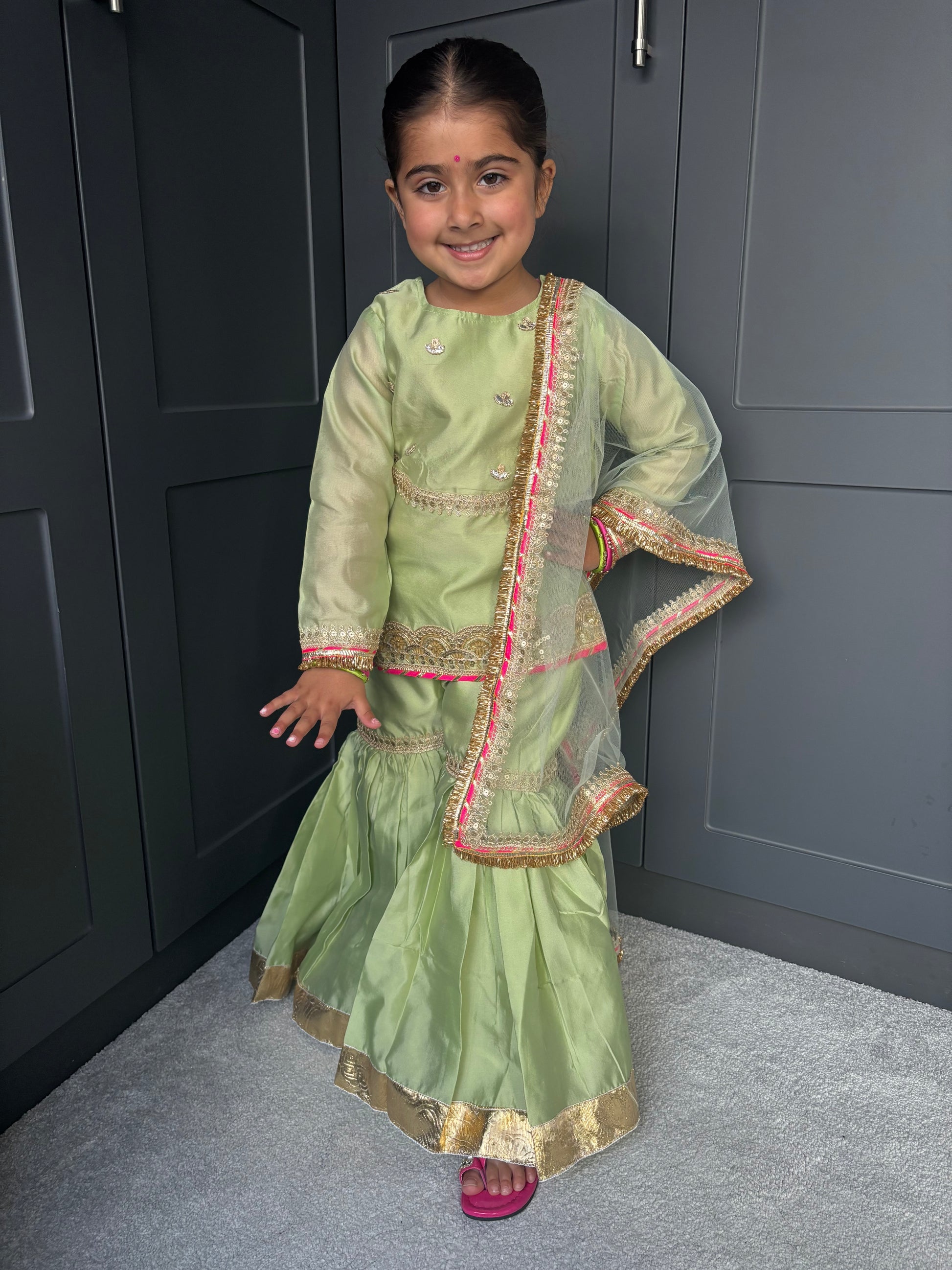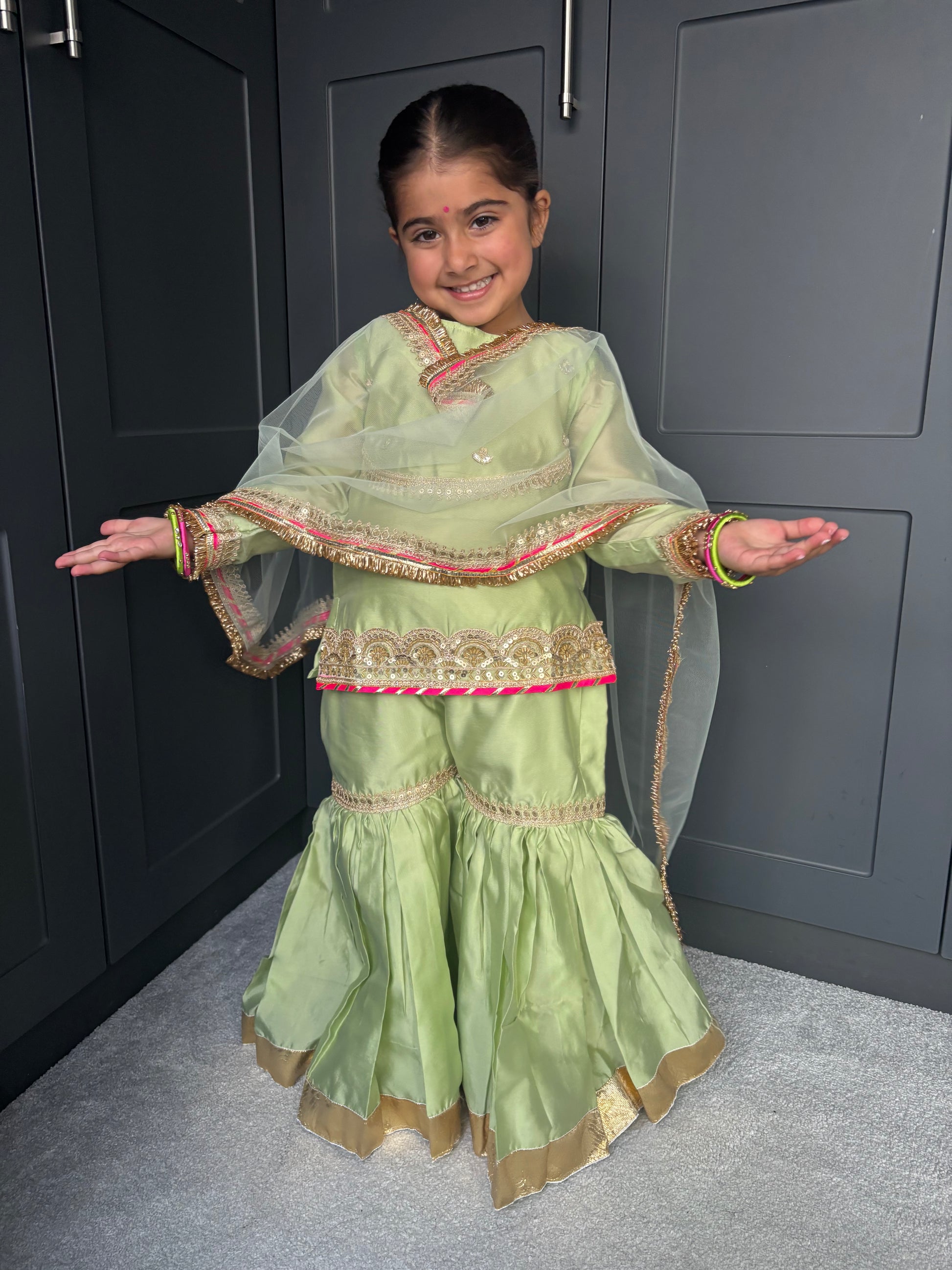 We love this adorable formalwear sharara set in mint green taffeta fabric with heavy gota borders on the arms and bottom of the kameez. The gorgeous short kameez is fully lined and has a zip to the back of the neck. The sharara bottom is also fully lined and has an elasticated waist. the outfit comes complete with matching net dupatta with beautiful border all the way around.