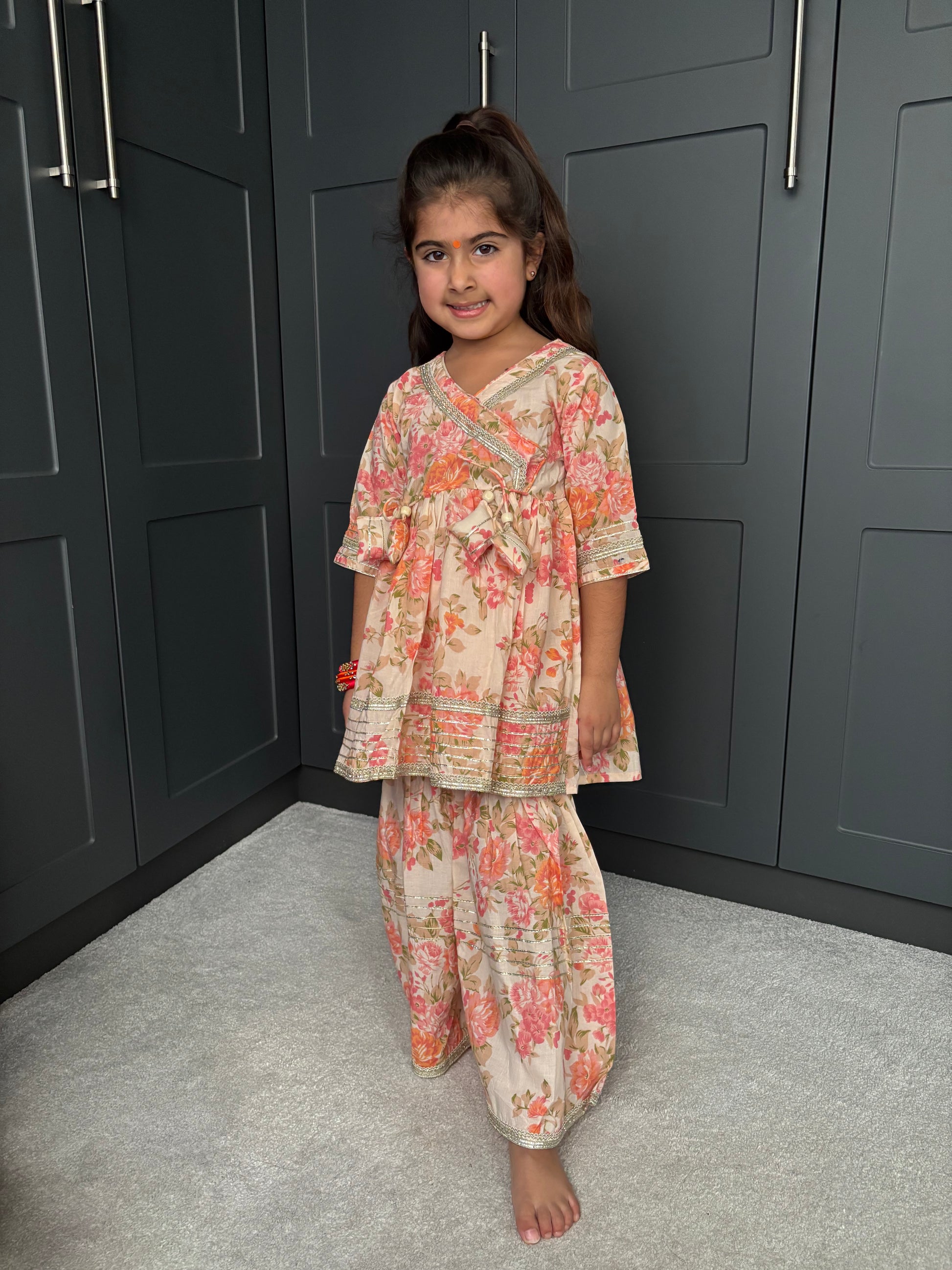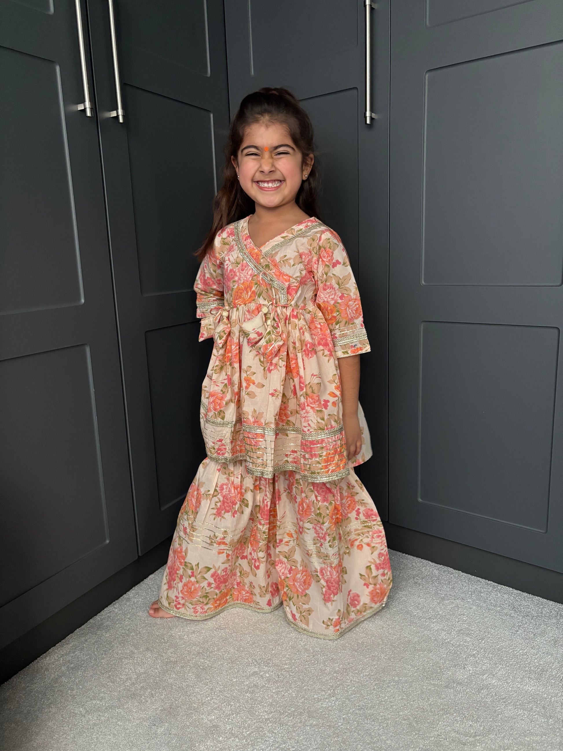 We love this vibrant floral sharara suit, featuring a beautiful array of peachy hues in our favourite cotton fabric. Finished with delicate gota detailing for a subtle hint of gold, and paired with a flowing chiffon dupatta.