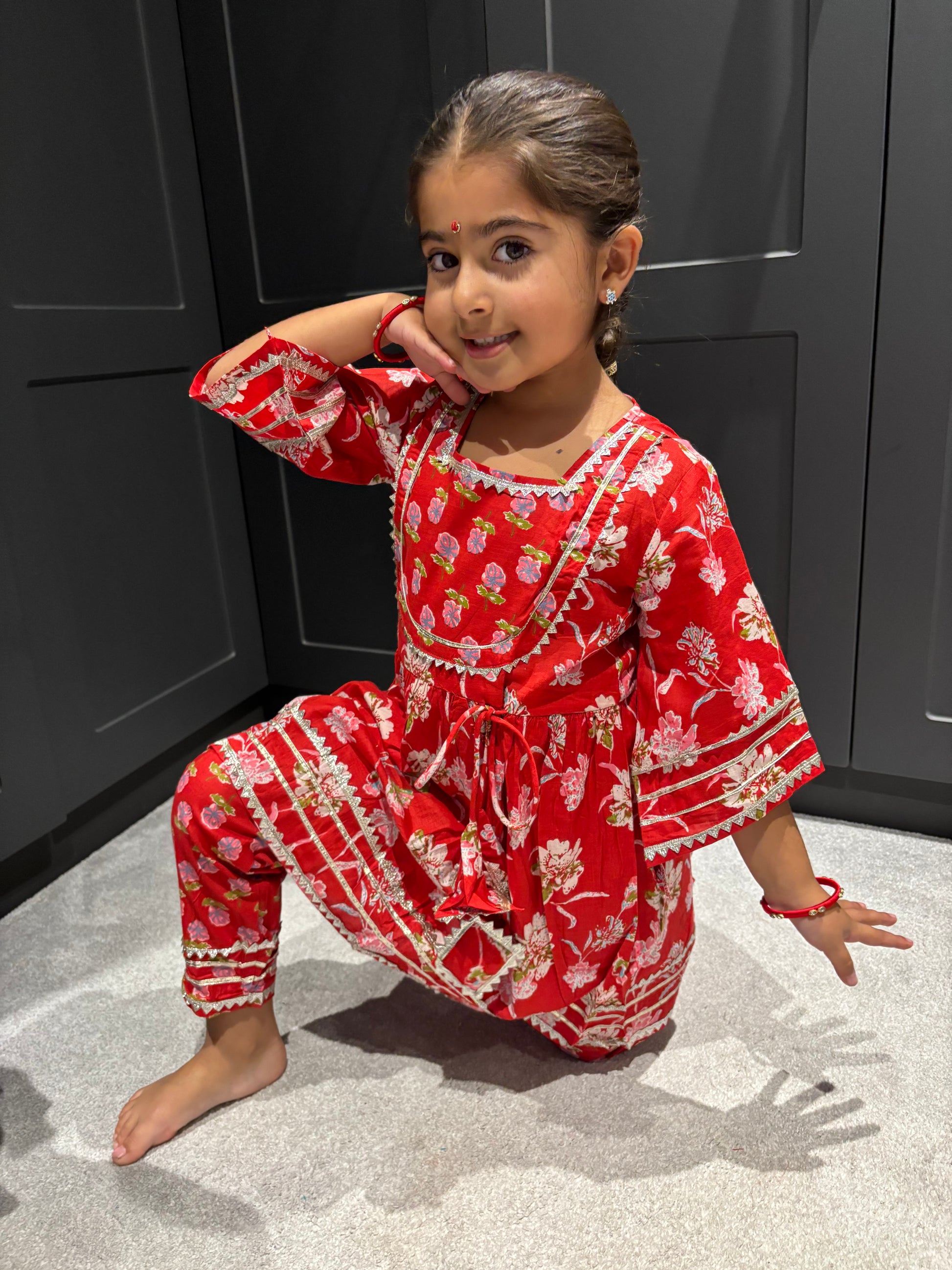 Turn heads this festive season in our vibrant red floral cotton suit, complete with straight trousers and a lightweight chiffon dupatta. The soft cotton fabric ensures all-day comfort, while the lively floral pattern adds a cute charm!!