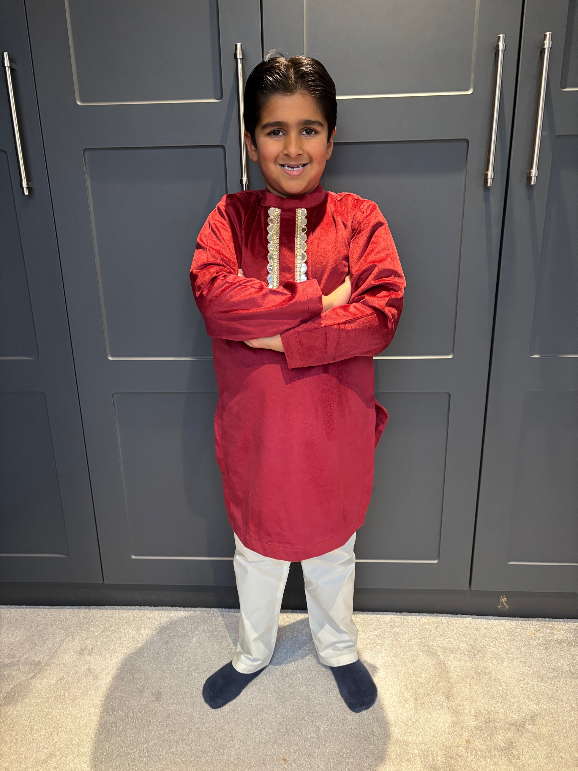 Gorgeous red velvet kurta with button fastening and mirror work detail around the neck, paired with a cotton pyjama with elasticated waist.