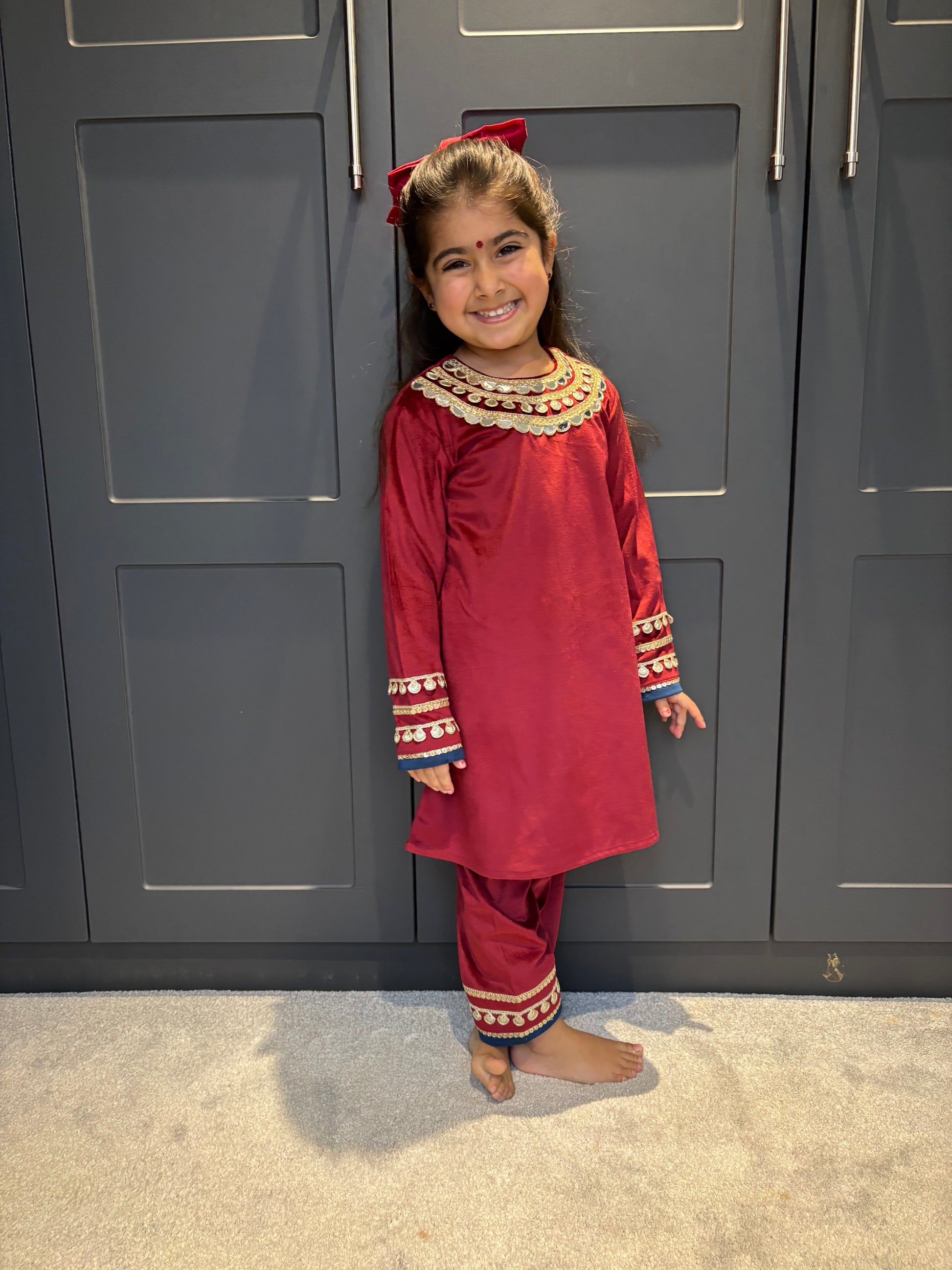 We have fallen in love with this stunning red velvet salwar suit, designed to make little ones shine on special occasions. It features beautiful mirrored lacework around the neckline, with matching detailing on the sleeve cuffs and around the ankles for an added touch of sparkle and elegance.