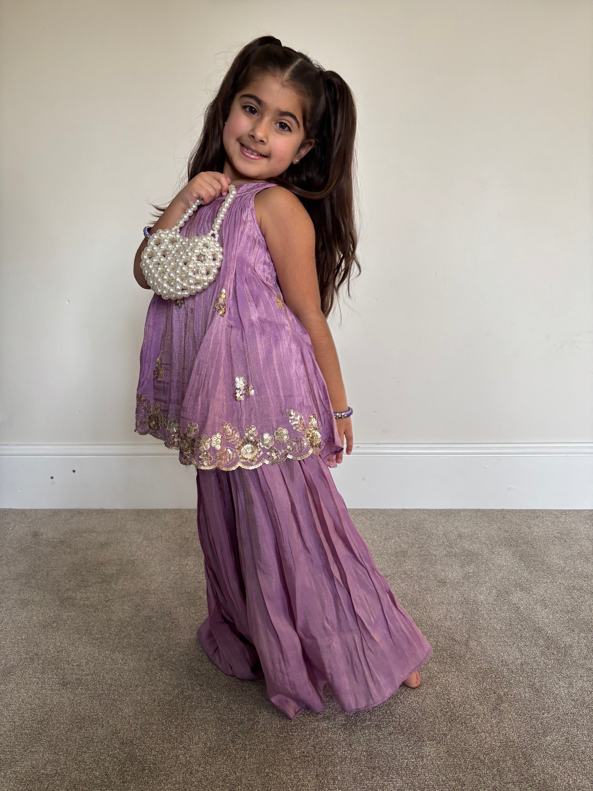 The outfit features a beautifully embellished blouse with delicate sequin work, paired with stylish palazzo trousers in a soft crushed silk effect. A lightweight net dupatta adds the perfect finishing touch, making it a dreamy choice for festive occasions, weddings, or special celebrations!