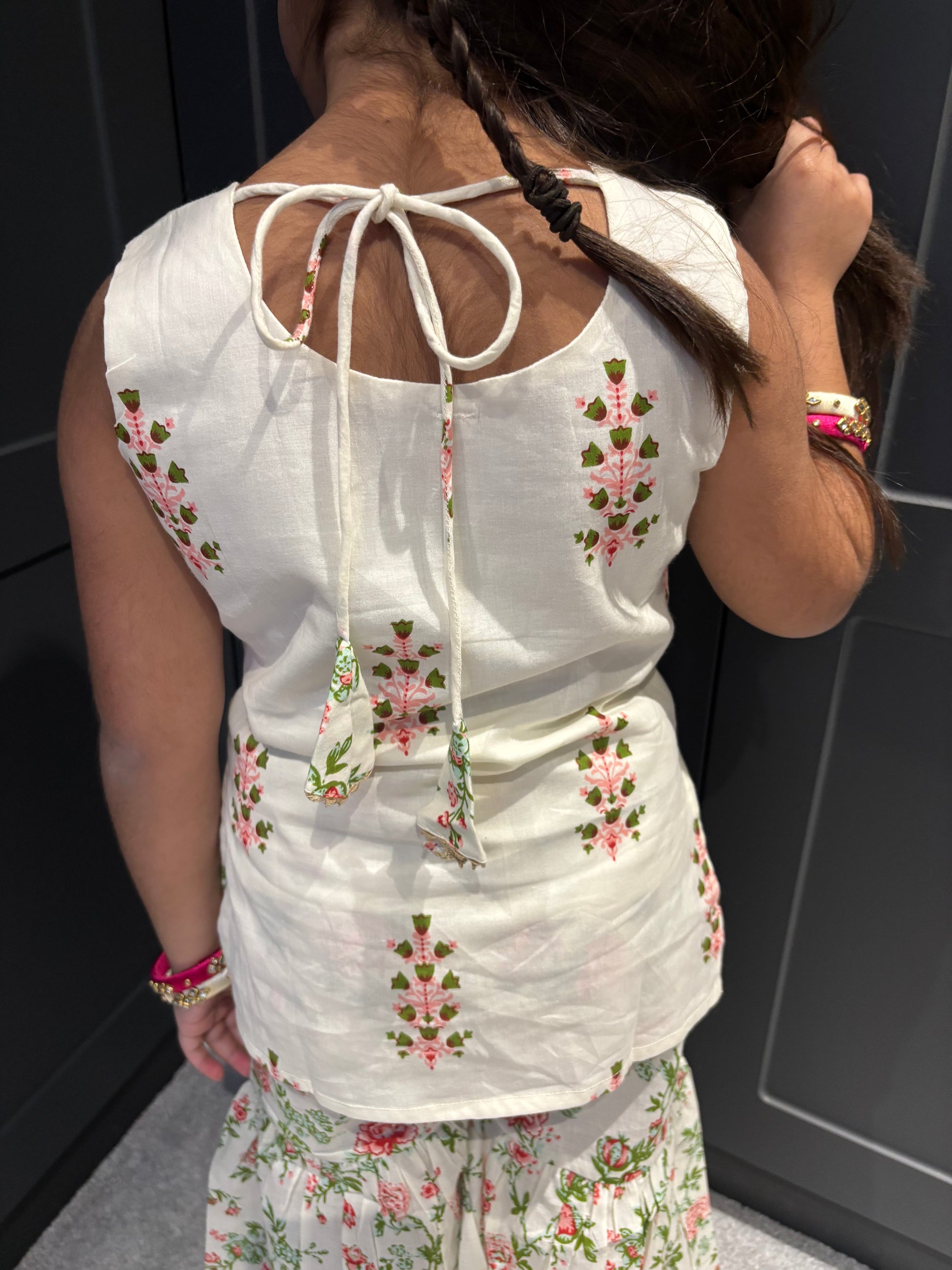 Beautiful cotton sharara suit on a cream base with an adorable floral print. The outfit is complete with net dupatta.
