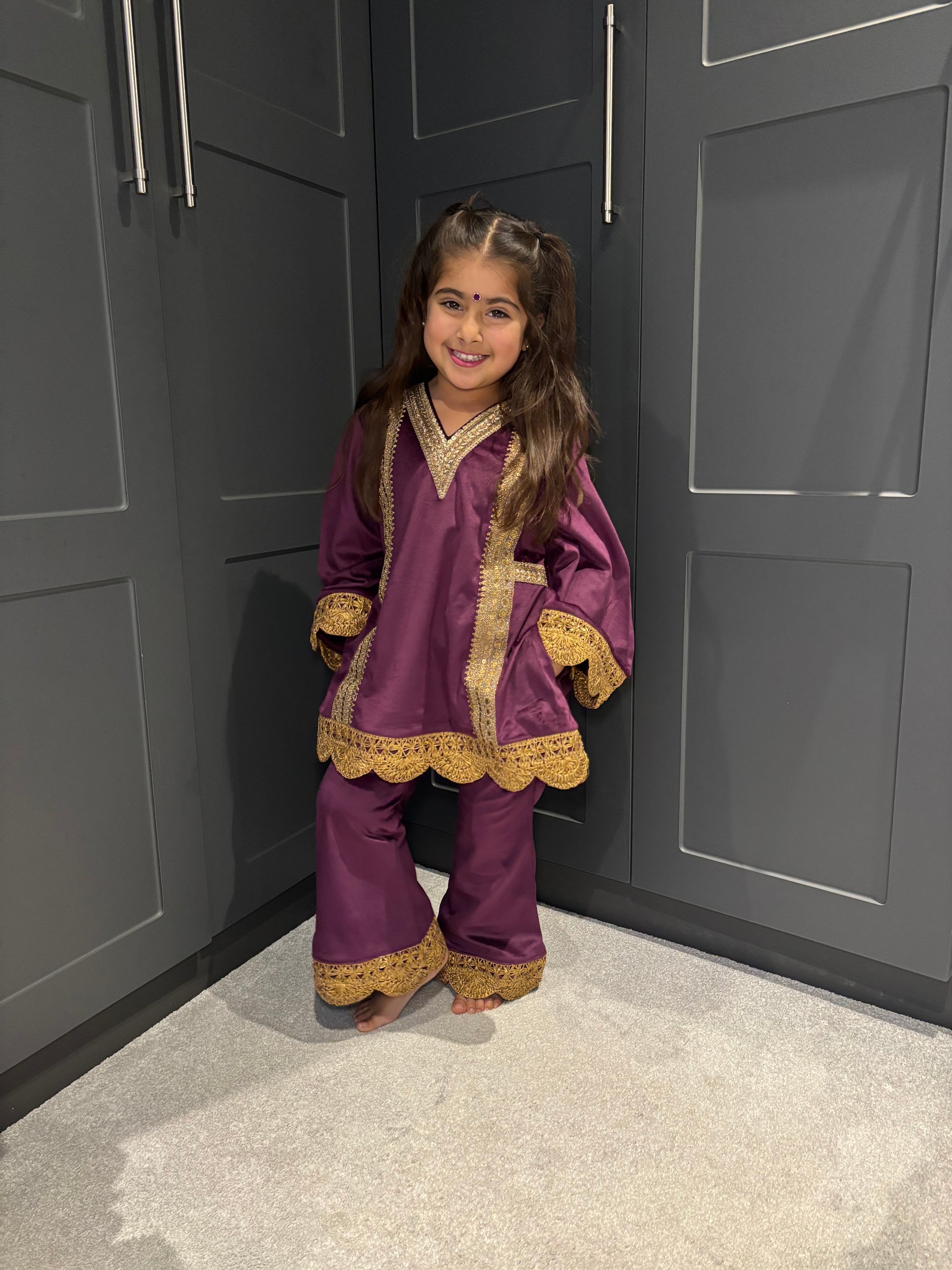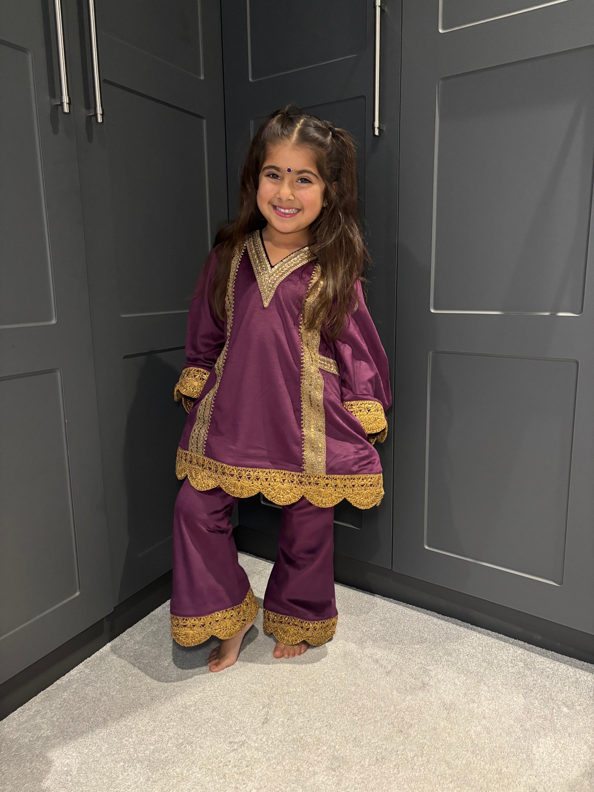 This velvet co-ord truly ticks all the boxes for both Mother & Daughter! Featuring a shorter kameez designed to show off the gorgeous, fitted flared trousers, this set is all about effortless elegance. The delicate lace detailing around the neckline, bell sleeves, and trouser hems adds the perfect finishing touch. Made with the softest velvet fabric to be gentle on your little one’s skin, elasticated waist on the trouser and button fastening to the back of the neck.