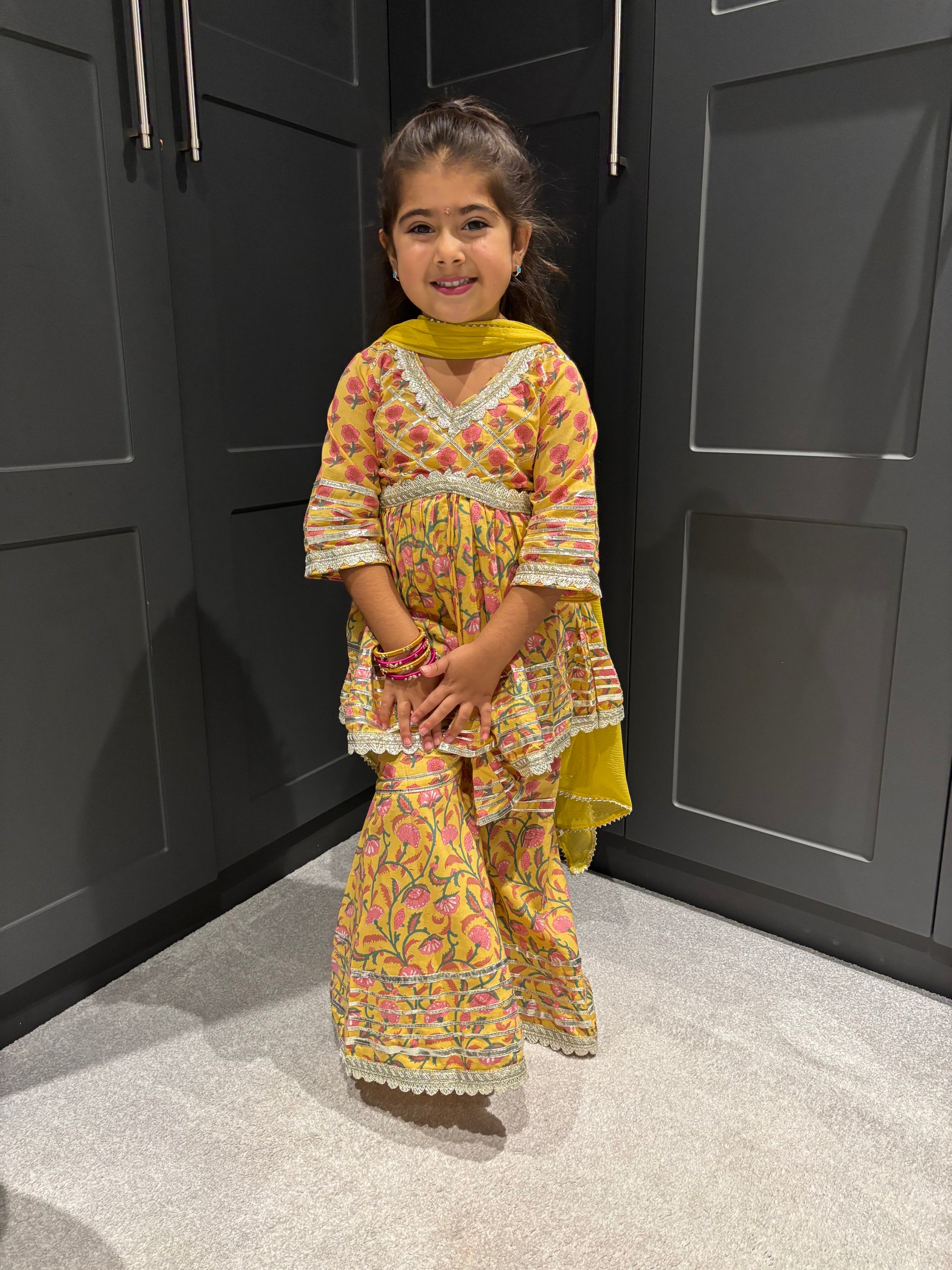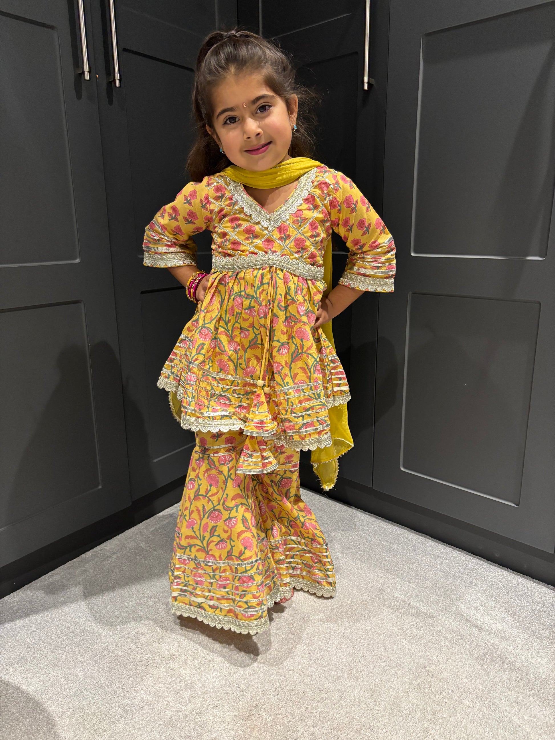 We love this vibrant sharara suit featuring adorable bell sleeves and frock style top! The outfit is complete with sharara bottom with elasticated waist and heavy gota detailing, finished off with a matching chiffon dupatta.
